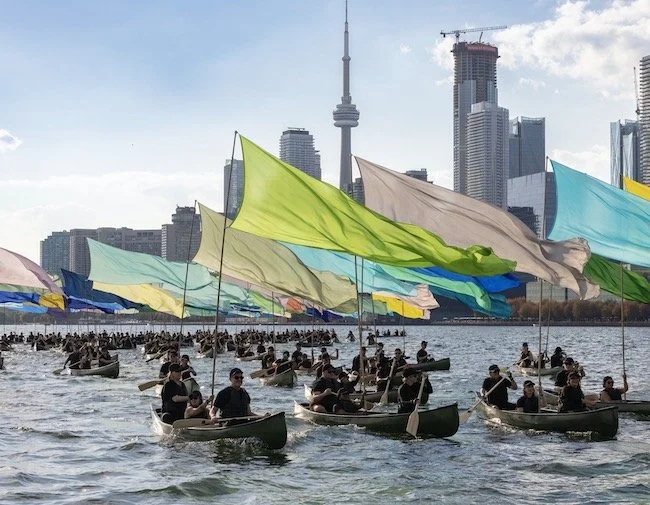 A Lake Story, in part, acknowledges Toronto Waterfront’s commitment to the re-naturalization of the city’s Don River. As Melissa McGill says, "This vibrant, waterborne canoe procession brings us together to engage with Toronto's watershed, celebrating our interconnectedness by writing the lake's own colour story across the sky and reflected in its waters."